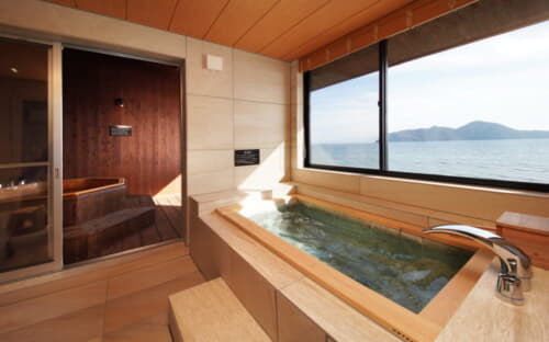 KUON的客房設有兩種天然溫泉和游泳池,並可在海景一覽無盡的私人餐廳中享用專屬廚師烹飪的創意意大利料理。