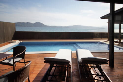 所有別墅都配有中庭泳池和赤湯私人溫泉。70㎡的別墅為整棟出租,即便是大人數入住也很舒適。